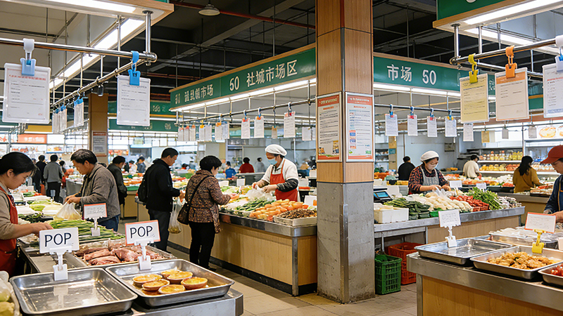 Install hanging rails + poster poles in main passages, hanging posters of market regulations (e.g., "fair scale location", "return policy") and promotions (e.g., "weekend special vegetables"). Rails allow easy sliding to replace posters, overall market standardization feeling increases by 50%, merchant satisfaction improves by 45%