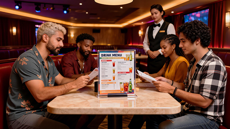 Place Beverage Menu Display Stands in each private room, showing classified drinks, snacks and packages in layers. Adopting large fonts + images to highlight hot-selling products, with waterproof and stain-resistant materials adapting to KTV environment, customer independent ordering completion time shortens by 45% and waiter ordering consultations reduce by 50%.